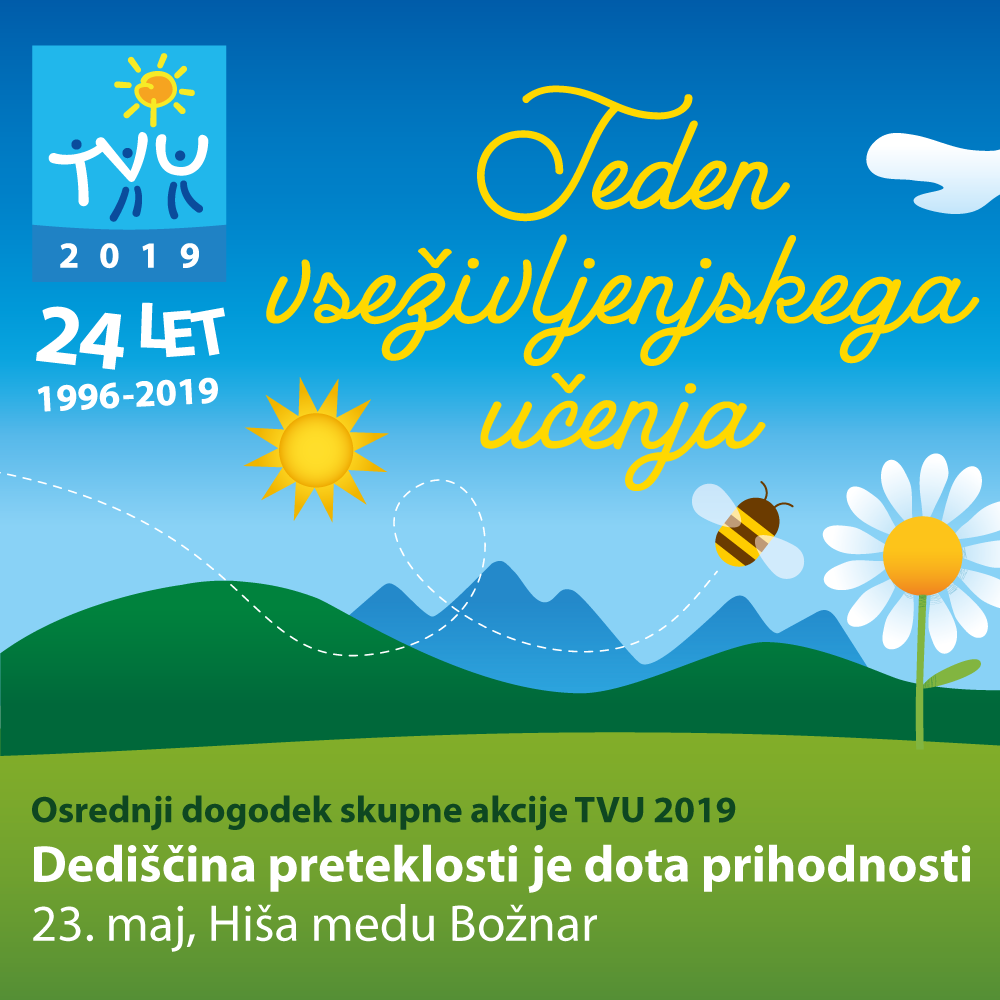 23. maj 2019, Hiša medu Božnar, Polhov Gradec Osrednji dogodek skupne akcije Tedna vseživljenjskega učenja (TVU) 2019 Dediščina preteklosti je dota prihodnosti.